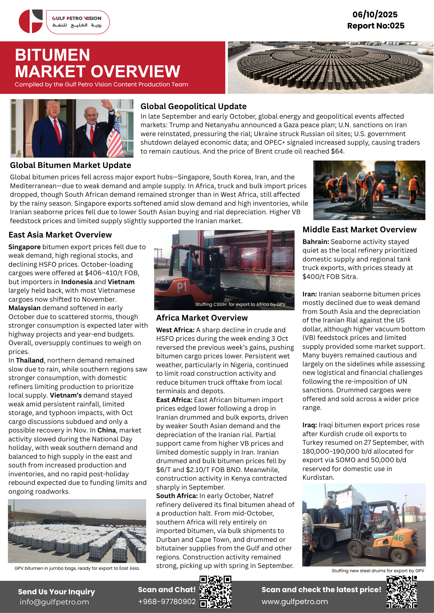 Global bitumen market update October 2025 prices fell across major export hubs—Singapore, South Korea, Iran, and the Mediterranean—due to weak demand and ample supply. In Africa, truck and bulk import prices dropped, though South African demand remained stronger than in West Africa, still affected by the rainy season. Singapore exports softened amid slow demand and high inventories, while Iranian seaborne prices fell due to lower South Asian buying and rial depreciation. Higher VB feedstock prices and limited supply slightly supported the Iranian market.