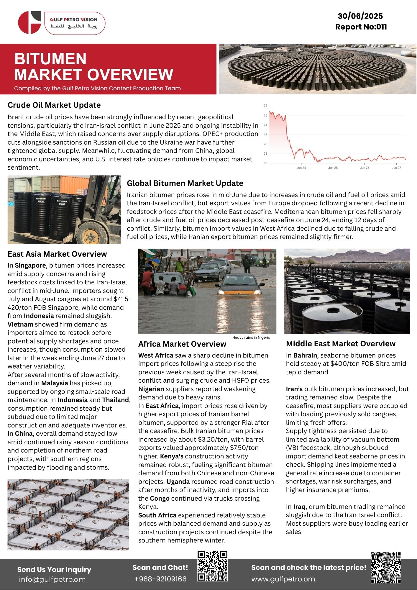 This week, Brent crude oil prices and bitumen price remained stable, trading within the $64-68/bbl range. The stability followed a decision by OPEC+ members to increase production, coupled with an Israeli-Iranian agreement to halt military operations. Although the agreement has eased tensions and reduced market volatility, concerns remain due to the ongoing Russia-Ukraine war and potential trade disputes between the US and China.
